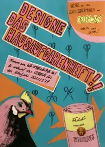 Unser schuleigenes Hausaufgabenheft für das Schuljahr 2026/2027 braucht dich! Lass deiner Kreativität freien Lauf und gestalte deinen Entwurf. Die beiden besten Cover werden für das nächste Hausaufgabenheft verwendet. Außerdem warten Urkunden und Preise auf die Gewinner. Reiche deine Idee analog oder digital bis zum 09.01.2026 bei deiner Kunstehrerin ein. Ein herzliches Dankeschön geht an den Kunstleistungskurs der Klasse 12 für die Plakate, die überall im Schulhaus zu finden sind.