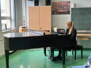 Die renommierte Pianistin Julia Rinderle besuchte die Klasse 7a des Brockhaus-Gymnasiums und bescherte den Schüler:innen ein ganz besonderes musikalisches Erlebnis. Mit beeindruckender Virtuosität spielte sie Werke wie Widmung (Liszt nach Schumann), den ersten Satz der Waldstein-Sonate von Beethoven, Debussys L’isle joyeuse, Beethovens Sturm-Sonate sowie Dans un vieux jardin von Lili Boulanger. Im Anschluss stellte sie den Jugendlichen ein Quiz, bei dem es sogar ihre aktuelle CD zu gewinnen gab. Außerdem nahm sie sich viel Zeit für Gespräche: Die Schüler:innen durften Fragen zu ihrem Leben als Musikerin stellen, zu den gespielten Stücken und ihren Klangeindrücken. Zum Abschied bedankte sich Julia Rinderle herzlich: „Danke für die tolle Organisation des Schulbesuchs, an den ich heute noch viel gedacht habe. Ihre Schüler:innen waren so aufmerksam und aufgeschlossen. Ich bin Ihnen sehr dankbar.“ Ein inspirierender