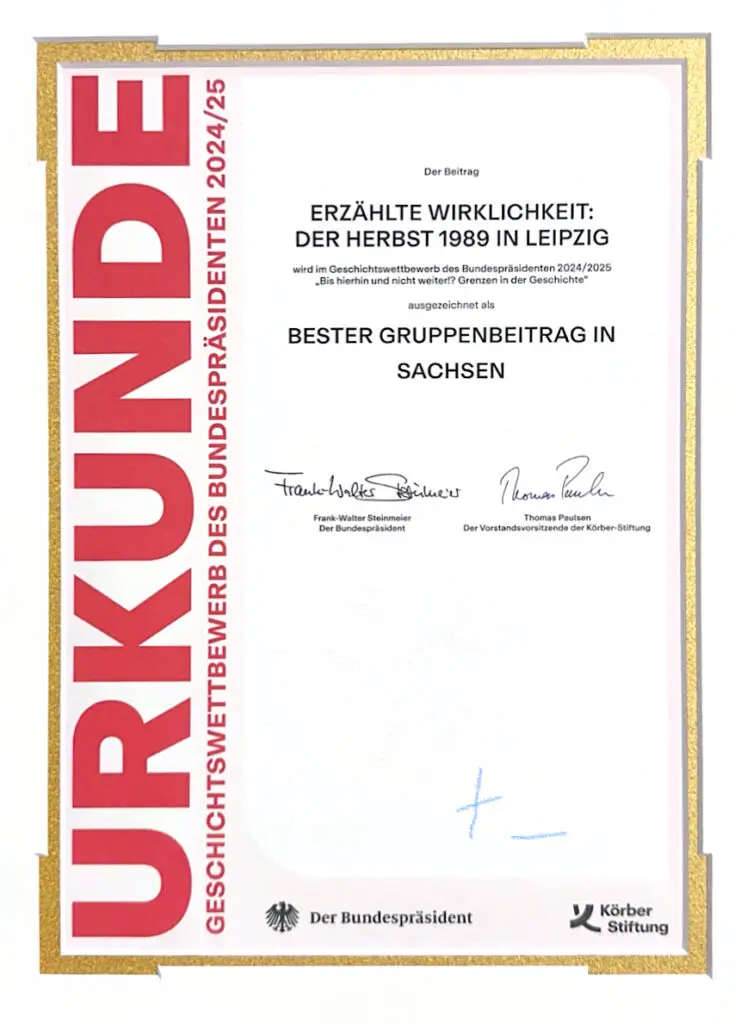 Die erfolgreiche Wettbewerbsteilnahme baut auf Erfahrungen auf, die unsere Schüler und Schülerinnen bereits im Herbst 2024 während der Projektwoche „Erzählte Wirklichkeit“ gesammelt haben. In Zusammenarbeit mit der HALLE 14 – Zentrum für zeitgenössische Kunst, Zeitzeugen des Leipziger Herbstes 1989, der Fotografin Margret Hoppe und der Schriftstellerin Constanze John setzten sich die Jugendlichen intensiv mit den Ereignissen der Friedlichen Revolution auseinander.