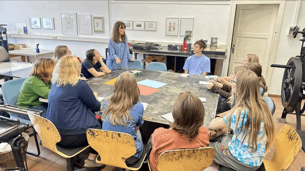 Das diesjährige Schwerpunktthema „Typografie“ zog sich wie ein roter Faden durch alle Arbeitsphasen. In individuellen künstlerischen Reisetagebüchern hielten die Teilnehmenden ihre Eindrücke, Entwürfe und Reflexionen fest. So entstand eine vielschichtige Sammlung, die sowohl den Prozess als auch die Vielfalt der künstlerischen Annäherungen dokumentiert. Die Kunstfahrt war geprägt von intensiver Auseinandersetzung, Teamgeist und einer offenen, kreativen Arbeitsatmosphäre. Schon jetzt ist die Vorfreude groß auf die Ausstellung der entstandenen Arbeiten sowie auf den nächsten Kunstfahrtkatalog, der die Ergebnisse in angemessener Form präsentiert und für die Schulgemeinschaft sichtbar macht.