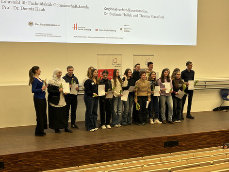 Unsere zwei Finalisten und unsere Finalistin haben sich der Herausforderung am 5. April am Carl-Friedrich-von-Siemens Gymnasium mit großem Einsatz gestellt und unsere Schule würdig vertreten. Auch wenn die Reise für sie dort endete und es leider nicht weiter zur Präsentationsakademie und zum Bundesfinale geht, nehmen sie viele neue Erfahrungen, wertvolle Rückmeldungen und persönliche Entwicklungsschritte mit – ein Gewinn, der über einen Wettbewerbserfolg hinausgeht.
