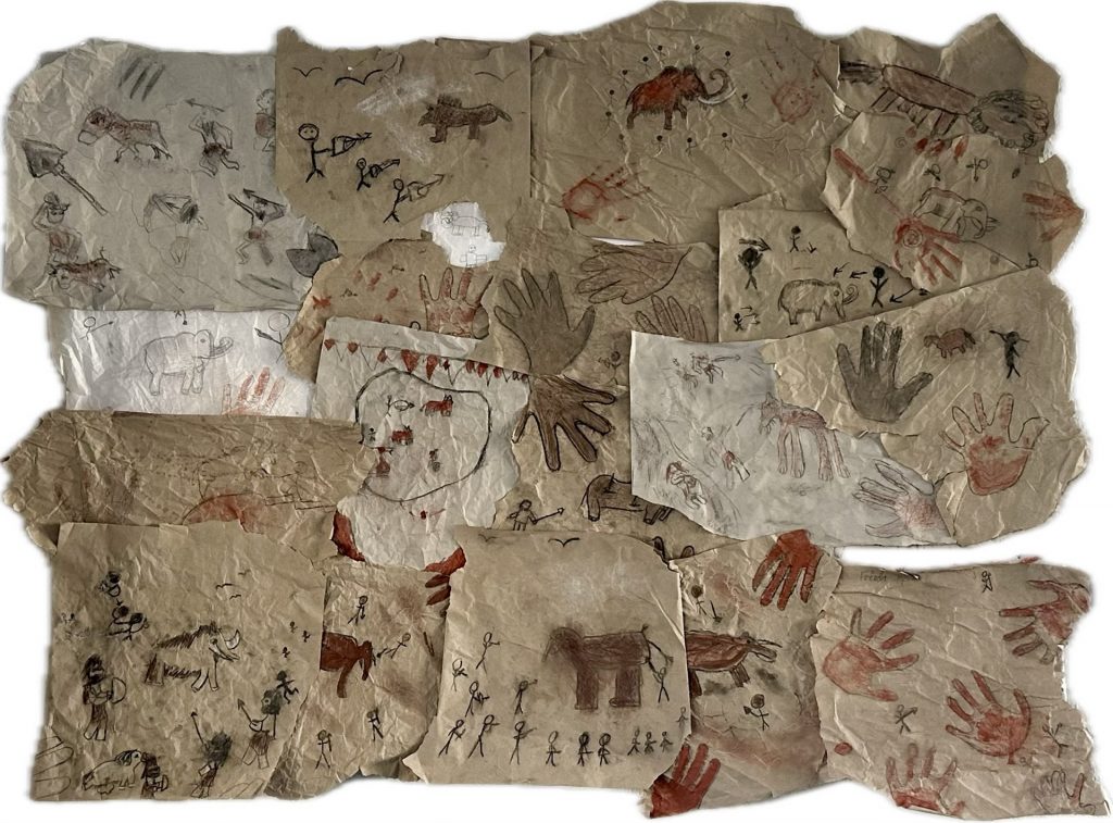 Im kunstbezogenen Teil des Projekts setzte die Klasse ihre kreativen Fähigkeiten ein, indem sie mit Kreiden, Kohle und Farben experimentierten, um die Formensprache der Höhlenmalerei selbst nachzuempfinden.