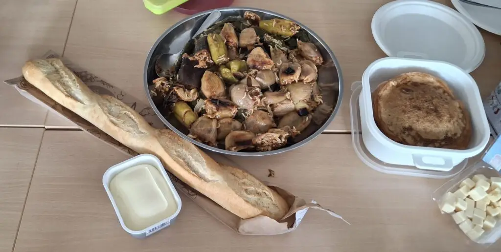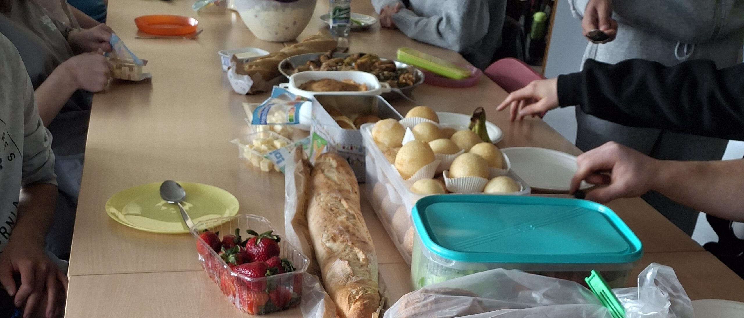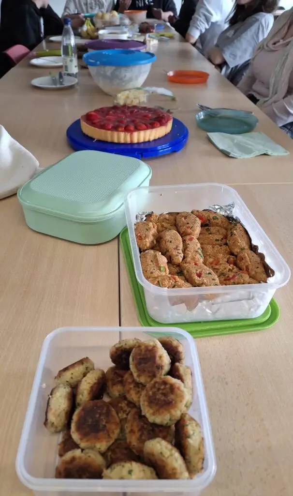 Schon beim Betreten des Raumes wurde klar, dass es sich um etwas Besonderes handelte. Der Duft verschiedenster Speisen lag in der Luft, Farben und Formen mischten sich zu einem beeindruckenden Gesamtbild. Neben vertrauten Klassikern wie Erdbeerkuchen, Kartoffelsalat oder Brot mit Käse und Butter fanden sich auch viele Gerichte, die für einige von uns ganz neu waren: knusprige Lumpia, würzige Kibbeh Ksabe, cremiger Hummus oder Batata Harra. Auch vegane Klöpse, gefüllte Weinblätter (Dolma), Blinis, Oladushki (Eierkuchen) und frittierte Reisbällchen zeigten, wie vielfältig Esskulturen sein können. Selbst einfache Dinge wie Gemüse mit Brot oder mexikanische Chips wurden Teil dieses bunten Buffets.