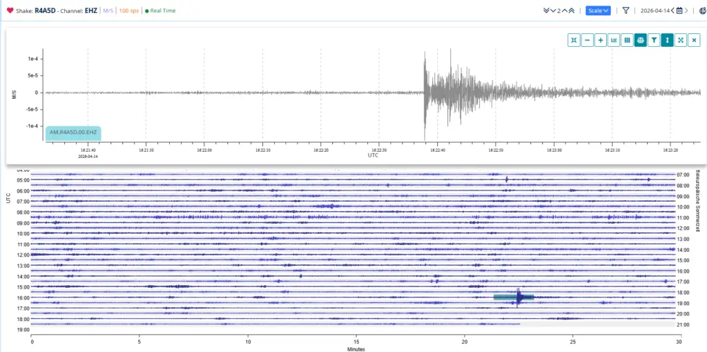 Was dabei besonders beeindruckt: Während viele das Ereignis nur kurz wahrnahmen, lieferte unser Schul-Seismograph präzise Messdaten in Echtzeit. Das empfindliche Gerät zeichnete die Erschütterungen zuverlässig auf und bewies einmal mehr seine Leistungsfähigkeit. Ein echter „Praxis-Test“, wie er spannender kaum sein könnte!