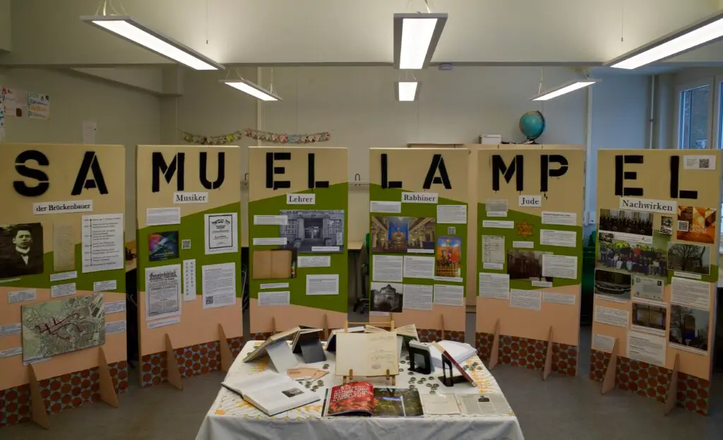 Nach dem Fes­takt wur­den im Schul­hof eine Kopie des Straßen­schilds sowie eine Gedenk­tafel enthüllt. Gle­ichzeit­ig eröffneten die Schü­lerin­nen und Schüler ihre Ausstel­lung über Samuel Lam­pel, die dem­nächst im Leipziger Schul­mu­se­um zu besichti­gen sein wird. Sie informiert auf sechs großen Ausstel­lungswän­den durch Texte, Bilder und Kopi­en von Orig­i­nalquellen über das Leben und Werk von Samuel Lam­pel sowie die Geschichte der Juden in Leipzig bis zur NS-Zeit und beleuchtet die beson­dere Rolle des Refor­mju­den­tums und der Musik von Samuel Lam­pel.