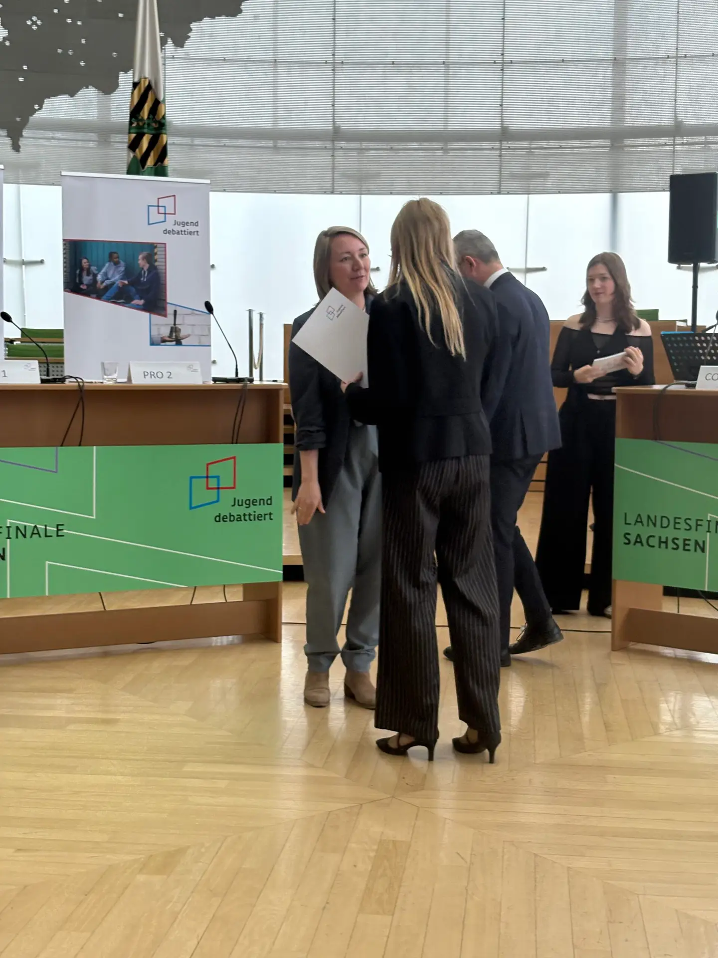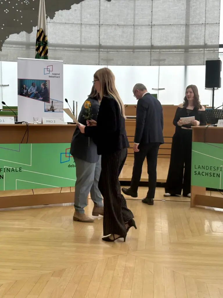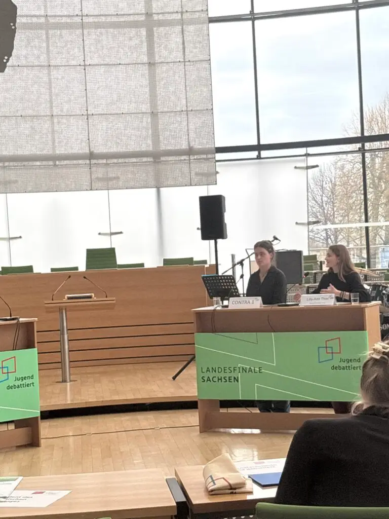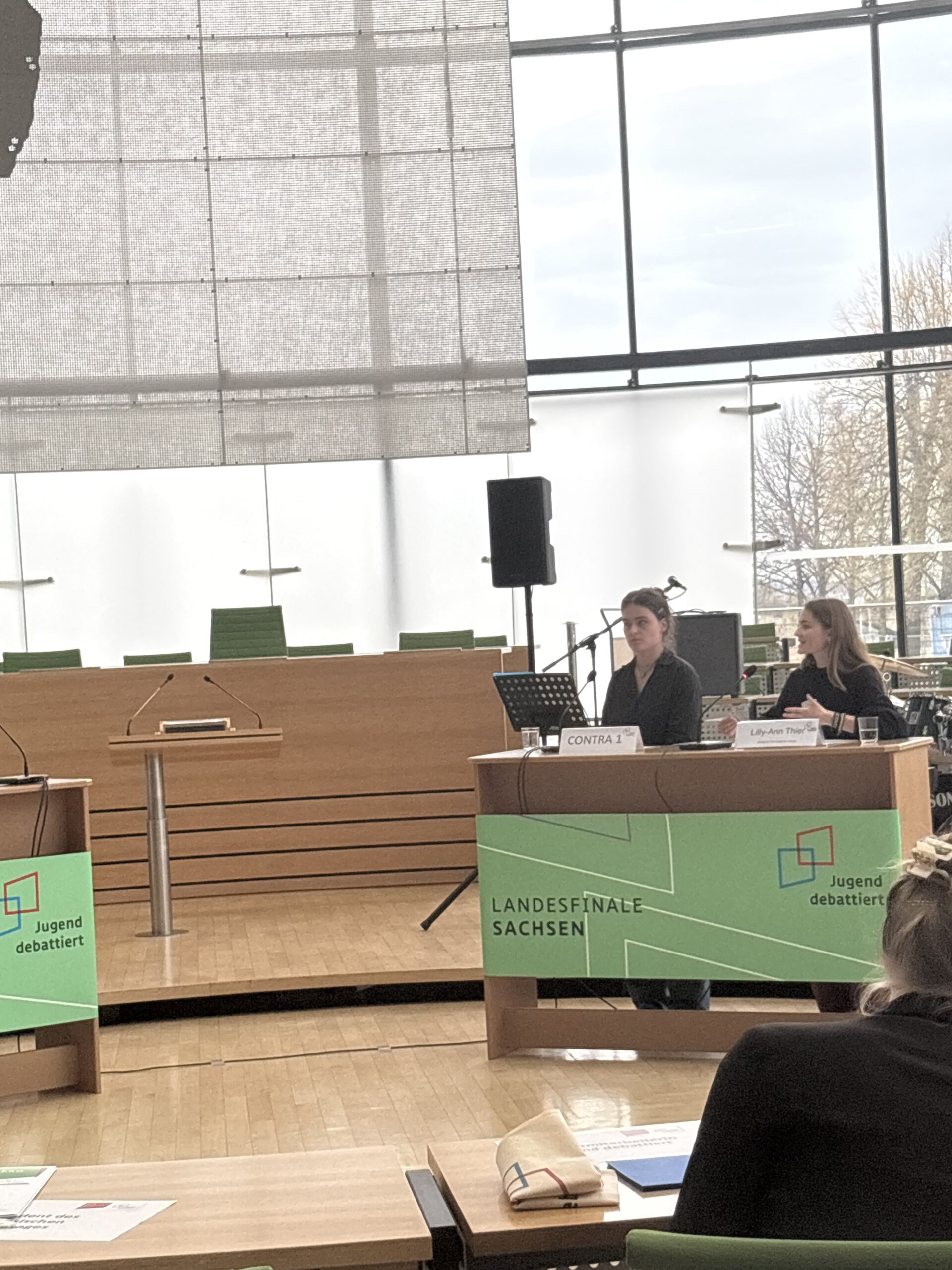 Hier zeigte Lilly Werner aus der Klasse 9d des Friedrich-Arnold-Brockhaus-Gymnasiums eindrucksvoll ihr Können. Mit großer Souveränität, klar strukturierten Argumenten und bemerkenswerter sprachlicher Präzision überzeugte sie bereits in diesen Runden und qualifizierte sich verdient für das Finale im Sächsischen Landtag. Schon hier wurde deutlich: Lilly ist nicht nur eine starke Debattantin des Regionalverbunds Leipzig – sie ist eine der besten im Landeswettbewerb.