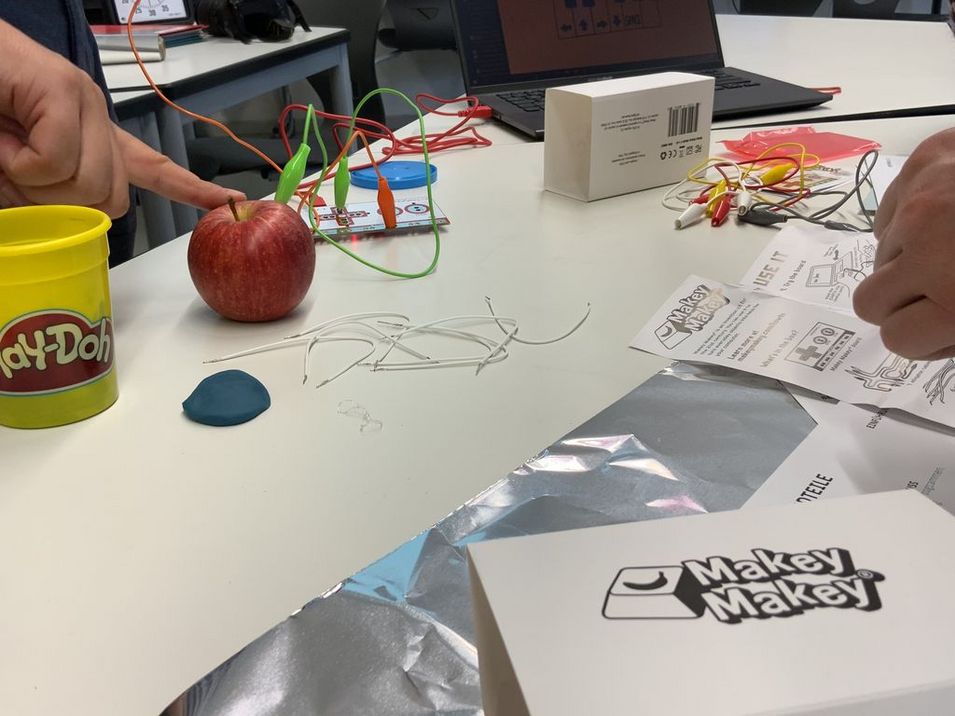 Besonders fasziniert waren wir alle vom Mikrokontroller Makey Makey, mit dem wir schnell und vor allem intuitiv sprechende Poster, miauende Äpfel oder vertonte Wassergläser erzeugen konnten.
