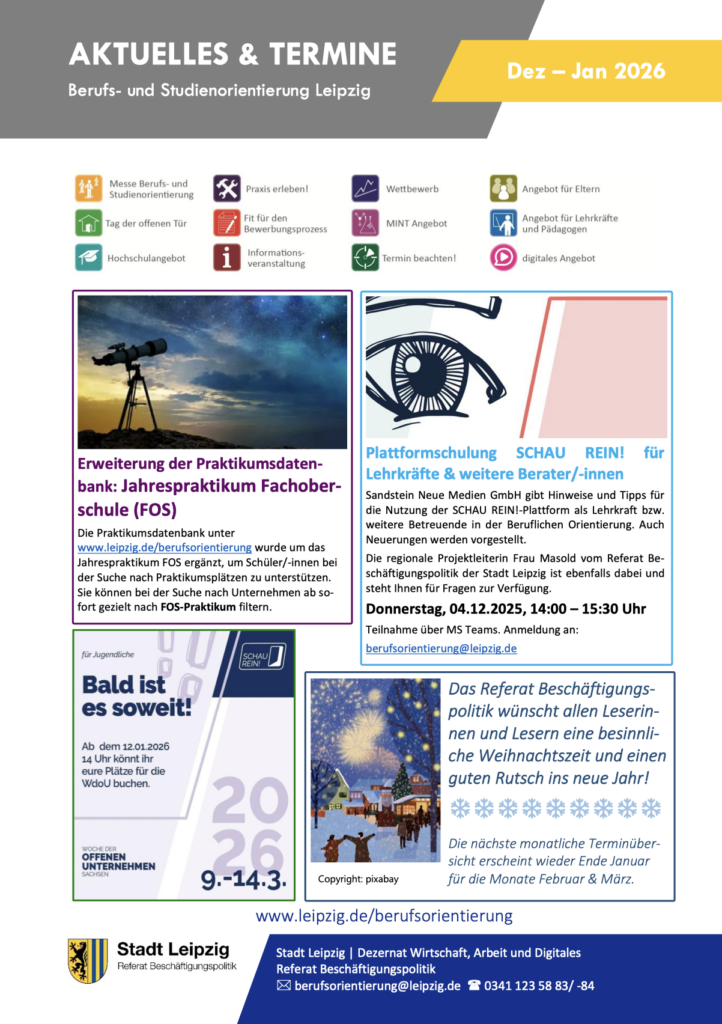 Zur Schau-Rein-Webseite kommst Du HIER, weitere Informationen zur Berufs- und Studienorientierung bietet die Stadt Leipzig HIER.