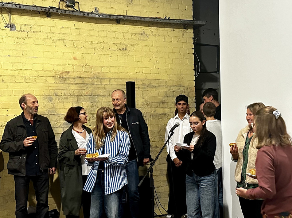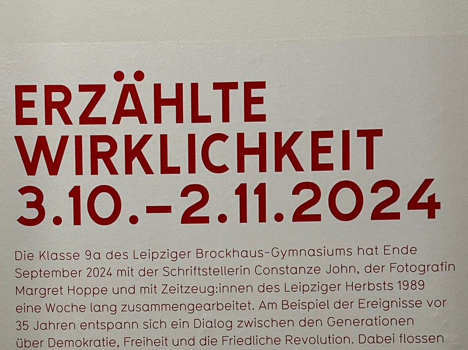 Die Ausstellung, die aus dieser Woche hervorging, bietet einen vielfältigen Blick auf die Erfahrungen und Erkenntnisse unserer Schüler und Schülerinnen. Zu sehen sind Fotografien und Eindrücke, aber auch eigene Texte und Interviews, die eindringlich die Geschichten der Zeitzeugen widerspiegeln. Am 2. Oktober 2024 um 18 Uhr ist die Ausstellung im Beisein aller Schülerinnen und Schüler der Klasse 9a, den beteiligten Lehrkräften Frau Sickert, Frau Dr. Braun und Frau Michael, dem Schulleiter Herrn Tramm, allen Zeitzeugen und Zeitzeuginnen, der Fotografin Margret Hoppe und der Schriftstellerin Constanze John, zahlreicher Eltern und weiterer Gäste durch die Kunstvermittlerin Kerstin Rupp in der HALLE 14 eröffnet worden und stellte neben der inhaltlichen Auseinanderetzung während der Projektwoche einen unvergesslichen und würdigen Abschluss eben dieser dar. Bis zum 2. November 2024 könnt ihr und können Sie die kreativen Ergebnisse der 9a noch bestaunen. Wir laden dazu ein, die intensive Auseinandersetzung mit der Leipziger Geschichte zu entdecken und die Möglichkeit wahrzunehmen, die persönliche Dimension zu erkunden und so die “Erzählte Wirklichkeit” zu erleben.